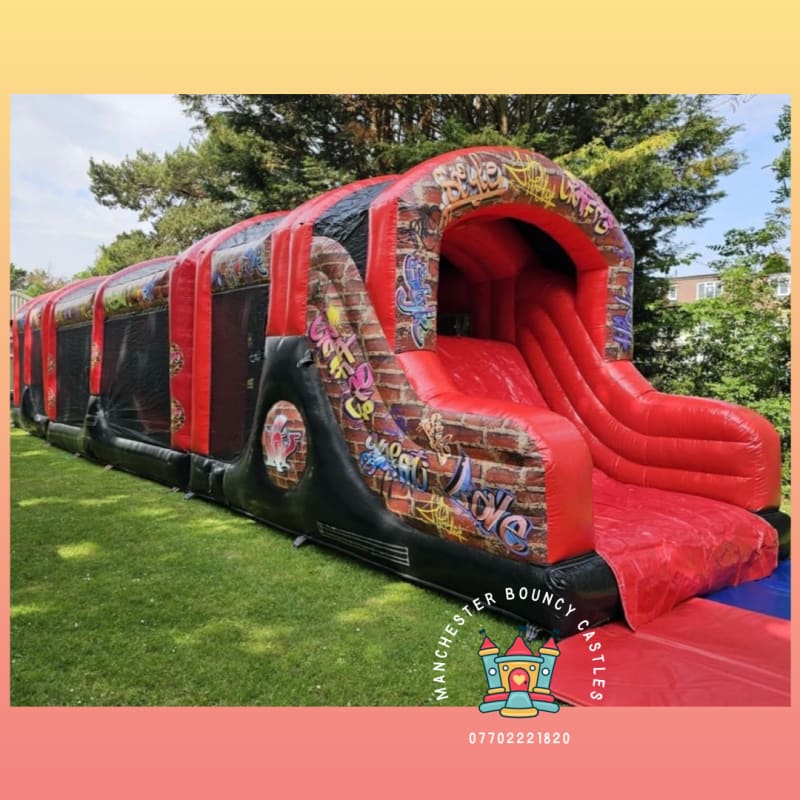 Introducing our newest addition at Manchester Bouncy Castle hire. Our 65ft Adult Obstacle Course is an absolute showstopper for any party, venue or occasion. Our Assault course to hire in Manchester is an absolutely incredible piece of equipment. This can be hired in a 2 or 3 parts at a maximum length of 65ft!!! Including an exciting 6ft platform slide!