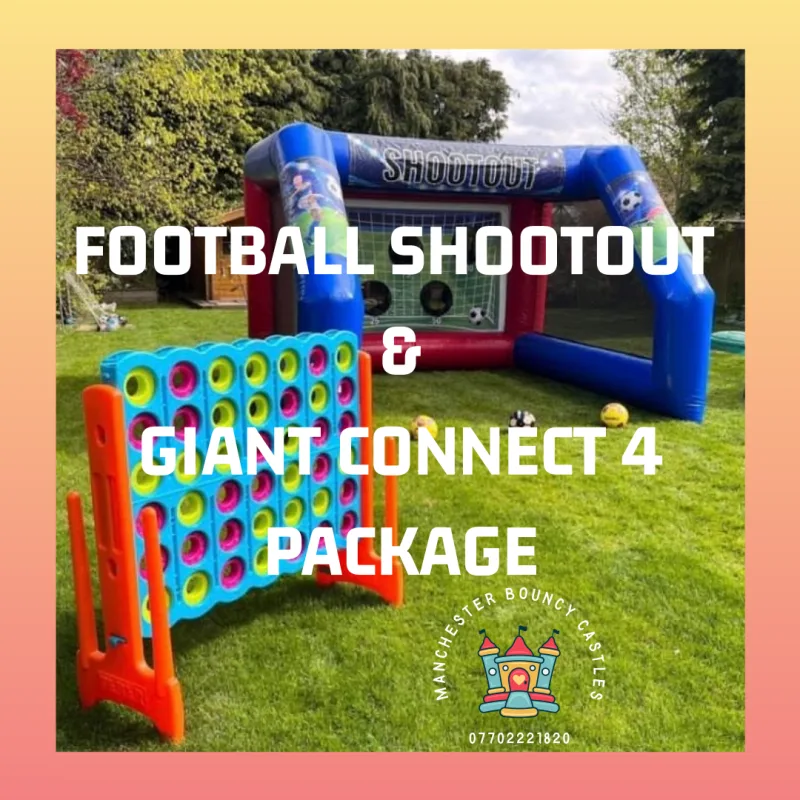 Football penalty shoot out inflatable for hire is perfect for any occasion, whether it be a football themed birthday party, family gathering or team building corporate event - our football penalty shoot out is sure to bring the entertainment to the party! In addition to the football penalty shoot out this package also includes our Feber Giant Connect 4, which again can be played with by children and adults alike!