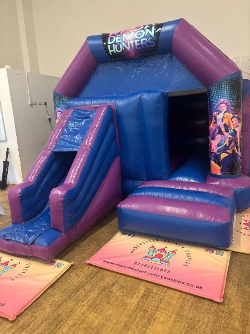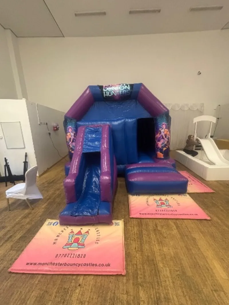 KPOP Demon Hunters theme combi castle is a great choice for your Huntrx party theme. Perfect for the little ones who want the best of both worlds - the bouncing fun of a traditional bouncy castle, combined with the added excitement of a slide. Our selection of bounce and slide bouncy castles for hire in Manchester are perfect for everyone!